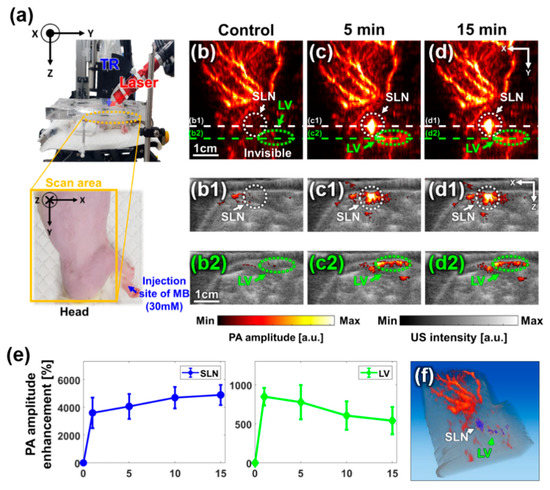 The experimental setup for in vivo SLN imaging is shown Figure 4a. The left side of the rat, which is marked with a yellow box, was scanned after removing the hair. The control PA image was acquired prior to MB injection, and the MB was injected into the left forefoot by using a 31-gauge insulin syringe. The PA images were acquired at 1 min, 5 min, 10 min, and 15 min post-injection to analyze the signal change over time (Figure 4b–d). White, dashed circles in the PA MAP images (Figure 4b–d) show the location of the SLN. In the control image, only the vascular structure is visible with no signal from SLN (Figure 4b). However, after injecting MB, the SLN is clearly visible with the strong PA amplitude (Figure 4c). The corresponding cross-sectional B-mode PA/US images, cut along the white, dashed lines in Figure 4b–d, are shown in Figure 4(b1–d1), respectively. Both the MAP images and the B-mode PA/US images show strong PA signals for the SLN. The lymphatic vessel (LV), through which MB travels to the SLN, is visualized both in the PA MAP image (green, dashed circles; Figure 4b–d) and the corresponding B-mode PA/US image slices (green, dashed circle; Figure 4(b2–d2)). We further quantified the enhancement in PA amplitudes of the SLN and LV with respect to time (Figure 4e). The enhancement was calculated as the ratio of the averaged PA signals in each region of interest (ROI) before and after MB injection. As MB travels through the LV and accumulates in the SLN, the PA signal in the SLN increased gradually while the signal in the LV decreased gradually soon after the injection. The PA signal at the SLN was enhanced >35 folds at 1 min post-injection and was further enhanced by ~50 folds at 15 min post-injection. In the case of LV, the peak signal enhancement was about nine folds at 1 min post-injection and then decreases gradually. Figure 4f shows the volume-rendered image of the overlaid PA/US images, where the SLN and LV are further highlighted with blue color, which is obtained by subtracting the control image from the image at 15 min post-injection [45] (Supplementary Video S2). The US image depicts the overall structural information of the rat body while the PA image highlights specific structures, including the vasculature, SLN, and LV.