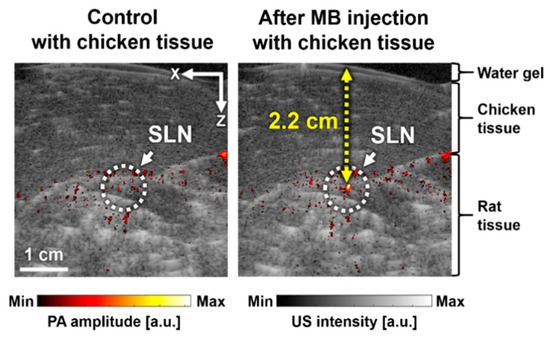To show the deep-tissue imaging capability, we imaged the SLN dyed with MB after stacking a layer of chicken tissue on top of the rat in vivo (Figure 5). The thickness of the chicken tissue was ~2.2 cm, which is deeper than the typical depth of SLN in humans (approximately 1.2 ± 0.5 cm) [40]. The cross-sectional B-mode PA/US images of the rat pre- and post-injection of MB are shown in Figure 4a,b, respectively. The SLN positioned deeply (~2.2 cm) was detected with a PA signal enhancement of 170 ± 25%. This result showed the feasibility of our SD-PAUSI system to image the SLN in vivo in humans.