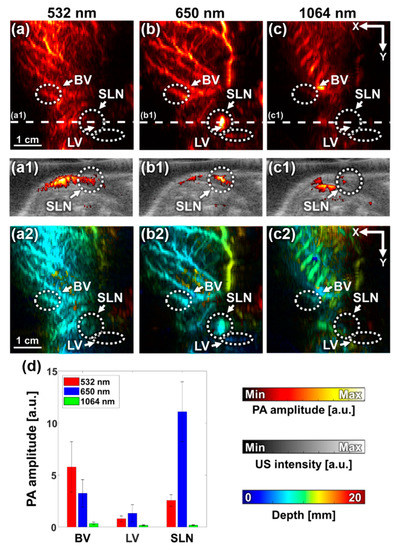 We performed multispectral PA imaging with optical wavelengths of 532, 650, and 1064 nm by manually switching the 650-nm and 532/1064-nm handpieces. Figure 6a–c shows the PA MAP images acquired at 532-, 650-, and 1064-nm wavelengths, respectively. The PA MAP image at 532 nm (Figure 6a) mostly shows the vascular structure, while the image at 650 nm additionally depicted SLN and LV dyed with MB. These results accurately described the spectral tendencies of hemoglobin and MB, which have a strong absorption peak near 532 nm and 650 nm, respectively. The PA MAP image at 1064 nm shows the rib cage and the surrounding vasculature. Figure 6(a1–c1) shows the B-mode PA/US images sliced at the corresponding white, dashed lines in Figure 6a–c. The B-mode PA/US images clearly showed that the SLN was selectively detected at 650 nm. The depth-encoded PA MAP images of the three wavelengths are shown in Figure 6(a2–c2), where the depth was calculated with respect to the shallowest location of the skin. The image obtained at 532 nm shows blood vessels in relatively shallow depths (around 0–1 cm), while 650 nm shows more vessels in deeper depths (up to 1.3 cm). Thus, the thick vessel depicted with yellow color in the vertical direction in Figure 6(b2) is better visualized at 650 nm than in 532 nm.