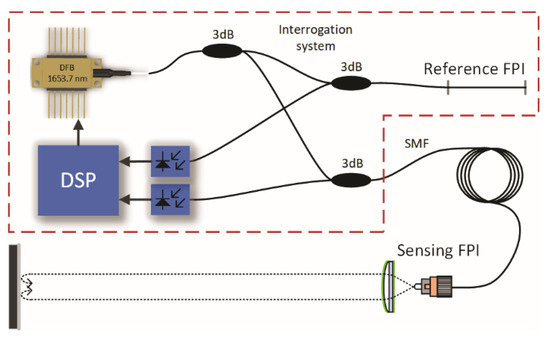 Figure 9. The interrogation system consists of a fiber-coupled DFB diode SBF-D653S2-110P8 (Wuhan Shengshi Optical Technology Co., Wuhan, China) with linewidth of lower than 10 MHz (0.1 pm), integrated into a butterfly case with a thermo-electric cooler (TEC), sensing and reference interferometers, two telecom detectors with transimpedance stages, and a digital signal processing unit. The DFB diode was driven by a programmable current generator (consisting of a 16-bit digital to analog converter and analog driver), while the TEC driver provided programmable temperature control of the DFB diode.