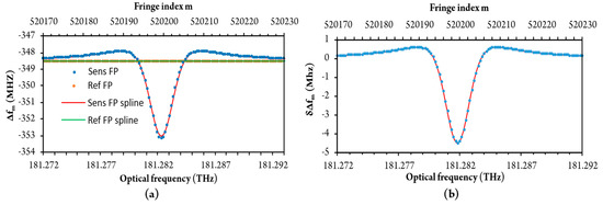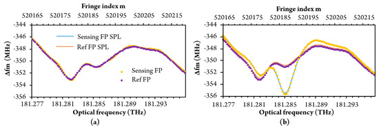 Figure 7a). The main cause for this deviation resides in the residual nonlinearity of the optical frequency sweep of the laser source. This is mitigated efficiently by subtraction of the sensor and reference interferometer fringe period versus fringe index data, as already explained in