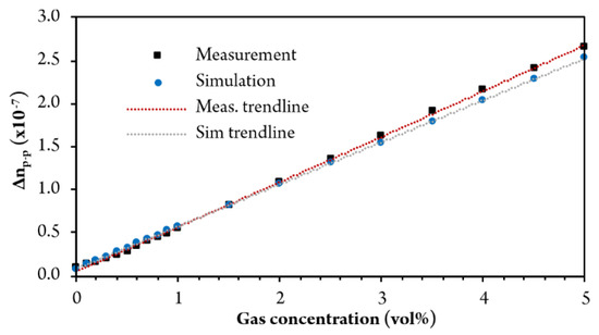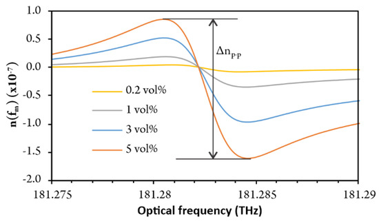 Figure 8 (using Equation (8)) finally yielded a curve that resembles the initial refractive index change. This curve was calculated for different volumetric gas concentrations. The curve corresponding to 3 vol% concentration clearly and closely resembles the original RI dispersion curve (