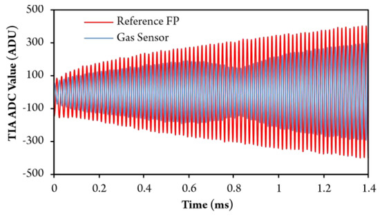 During testing, the laser diode optical frequency was always swept for 16.4 GHz (250 pm) within 1.4 ms. Recorded TIA digital responses from the gas sensor and reference FP Interferometer are, for example, shown in