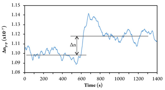 To establish a sensor’s static characteristics, i.e., the correlation between the amplitude of peak-to-valley difference Δnp-p and actual methane concentration, we firstly evacuated the gas chamber fully using the vacuum pump and refilled it with the ambient air. Then, small, predetermined amounts of pure methane were injected repetitively into the chamber, to increase the methane concentration gradually in the desired concentration steps. Since the additional volume of introduced gas increases pressure within the gas chamber, it was also necessary to equalize pressure to atmospheric pressure prior to measurement (after the gas was mixed).