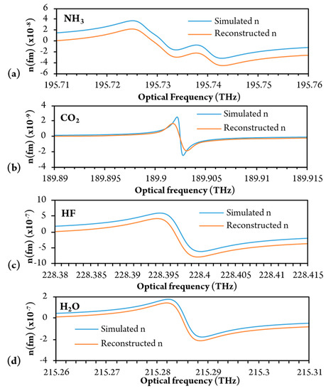 2, HF, and water were selected for simulation, and sensor sensitivity and resolution were correlated to the results obtained by the methane gas experimental setup (we assumed that the RI resolution would be the same for all gases). Simulated and reconstructed refractive index dispersion curves for each gas are presented in