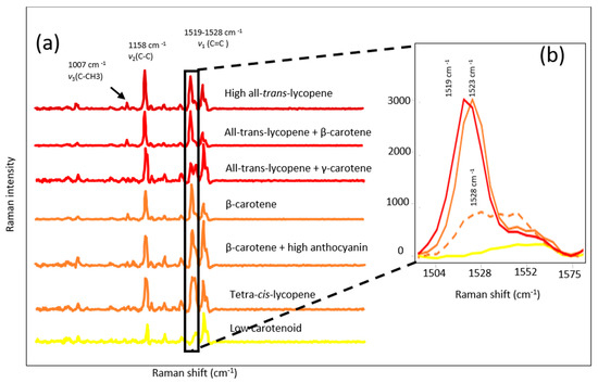The Raman spectra of selected red, tangerine, orange (high Beta-carotene), and yellow (low carotenoid) tomato breeding material are shown in Figure 2a. All Raman profiles showed common bands at 1007 cm−1 and 1158 cm−1 associated with C-CH3 in-plane-rocking and C-C stretching, respectively. However, visual evaluation of Raman spectrum showed a shift at around roughly 1520 cm−1 corresponding to C=C stretching depending on the major carotenoid of the tomato (Figure 2b). Tomatoes containing predominantly all-trans-lycopene showed a band maximum at 1519 cm−1, tomatoes having tetra-cis-lycopene and β-carotene showed a shift in the band centered at 1523 and 1528 cm−1, respectively. The low carotenoid samples did not show any significant carotenoid band in the Raman spectrum (Figure 2b). The position of the C=C stretching Raman band was inversely related to the length of the conjugated polyene chain, isomerization (trans vs. cis), the side groups of polyene chain and the presence of other constituents bonded to carotenoids in the plant material [13,40,41,42].