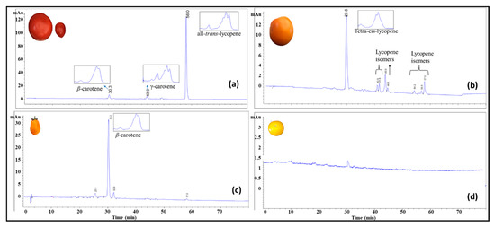 High-performance liquid chromatography (HPLC) chromatogram monitored at 450 nm and their corresponding absorption spectrum collected by the photodiode array detector for carotenoids in selected tomato breeding material. (a) Red tomatoes; (b) tangerine tomatoes high in tetra-cis-lycopene; (c) tangerine tomatoes high in β-carotene; (d) yellow tomatoes low in all carotenoid.