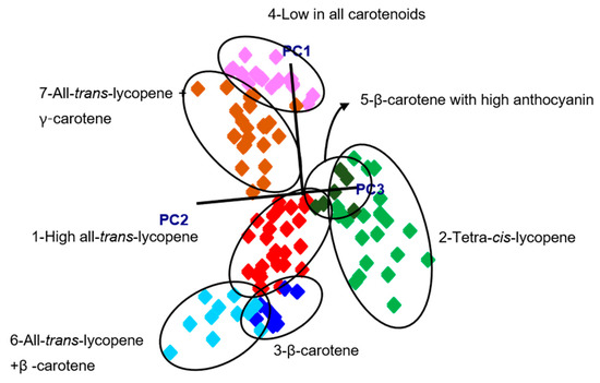 After the assignment of classes based on HPLC carotenoid profiles, pattern recognition algorithms were built using SIMCA. The spectra were preprocessed before analysis by using standard normal variate (SNV) and Savitzky-Golay second derivative filtering (25-point window) to remove scattering noise effects and correct for baseline drift. The SIMCA model was able to separate the groups based on the information in the 1370–1700 cm−1 region and revealed seven clusters instead of the four suggested by HPLC. These seven different groups were based on their dominant carotenoid profile as well as the presence of other carotenoids or anthocyanins resulting in the following classes: (1) high levels of all-trans-lycopene and no β-carotene, (2) all-trans-lycopene and β-carotene, (3) all-trans-lycopene and γ-carotene, (4) β-carotene (and low lycopene), (5) β-carotene and anthocyanins, (6) tetra-cis-lycopene, and (7) low in all carotenoids. The class projections (Figure 4) of the seven groups showed well separated classes in a three-dimensional environment using the first three principal components (PC). Interclass distances (ICD) values ranged from 3.4 to 38.5. The highest ICD (38.5) was between low carotenoid and the all-trans-lycopene + β-carotene group, while lowest ICD (3.4) was between tetra-cis-lycopene and the all-trans-lycopene (high) group. Our study showed that all ICD values between classes were >3 (Table 1) with significant separation of clusters [22].