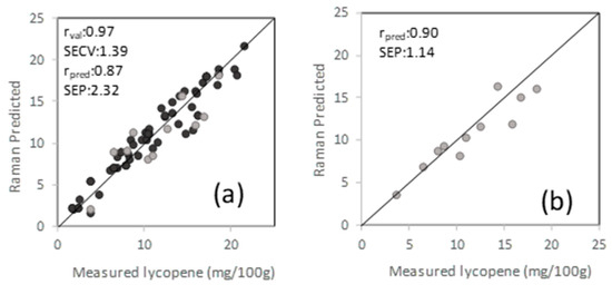 Among 106 samples, 58 had all-trans-lycopene, and 17 had β-carotene as the dominant carotenoid based on HPLC results. Quantification of all-trans-lycopene and β-carotene was performed using UV-Vis spectrophotometer, and concentration ranged from 1.8 to 21.5 mg/100 g for all-trans-lycopene and 1.6 to 9.5 mg/100 g for β-carotene. PLSR was used to correlate spectral and reference analysis data using the Savitzky-Golay second derivative filtering with a window size of 15 and smoothing that removed the effect of variation in the baseline [45]. PLSR models were generated using a calibration (80%) and external validation (20%) data sets. Cross-validation (leave-one-out) of the calibration set selected four latent variables that explained most of the variance in the data and avoided overfitting, giving a correlation coefficient of and standard error of cross-validation of 1.4 mg lycopene/100 g (Figure 5). By using the external validation set, the PLSR model gave prediction performances of 0.87 for correlation coefficient and a standard error of prediction (SEP) of 2.3 mg lycopene/100 g sample. The only report to our knowledge available for lycopene quantification in tomatoes using a handheld Raman spectrometer (1064 nm) has showed an R2 of 0.88 in their regression model, with no error value or external validation data set reported [46]. Sheng et al., [47] reported on a non-destructive method for lycopene determination in cherry tomatoes, with a lycopene concentration of 7.51 ± 1.27 mg/100 g, using portable NIR spectroscopy, reporting a correlation coefficient of 0.80 and SEP of 0.74 mg/100 g. Our data set had a wider lycopene range and comprised different types of tomatoes, including round, Roma, cherry, and grape tomatoes.