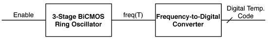 During the last decade, there have been numerous proposals for temperature sensors mainly oriented towards the needs of DTM systems [1,12,13,14,15,16]. They usually have a common feature which is avoiding the use of ADCs to save area and power consumption; instead, they employ a time-to-digital converter (TDC) or a (FDC) to perform the digitization. The sensing mechanism of this type of architecture can be illustrated by an inverted-based ring oscillator. The delay of each inverter in the oscillator has an almost-linear dependence on the temperature and so does the oscillation period. A digital counter is used as an FDC to perform the digitization. This type of architecture is small, easy to integrate, and requires little power consumption; however, providing high accuracy values is challenging as it is very prone to process variations.