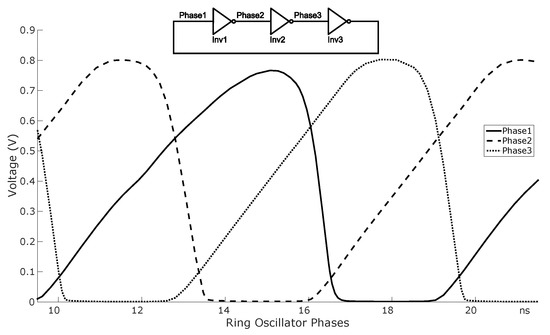 Turning now to the operation of the ring oscillator, Figure 3 shows the transient voltages of the three nodes of the oscillator, Phase1, Phase2, and Phase3. The waveforms are easier to understand if we focus on the transient behavior of one of the inverters. Let us suppose we depart from a state in which and change from above to below . The NMOS transistor will cut off, and the output node will start charging up through the collector current, , of the BJT. Whenever the output surpasses the next stage NMOS , the ripple will propagate to the next stage. Now we consider the moment when surpasses the NMOS , at that time the output node will discharge through this transistor. The sizing of the NMOS transistor has been carefully chosen so that the discharge time (the time it takes to discharge from the previous high value to ) is very small in comparison to the charge time (from 0 V to ); in particular, the aspect ratio of the NMOS was designed to be equal to 1250.