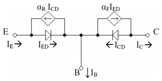 We want to express as a function of the temperature. For that, we substitute the PNP transistor by its Ebers–Moll model, as shown in Figure 4.