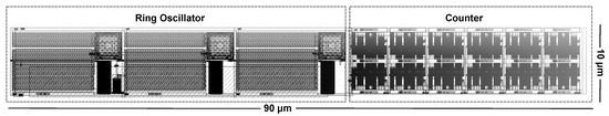 The area of the sensor is 900 m, Figure 7 shows the layout of the design. As shown, the floorplan is well divided between the ring oscillator and the digitization counter. The simplicity of the structure makes the design specially compact.