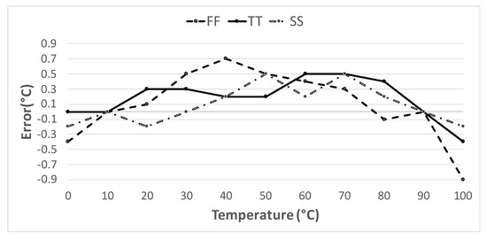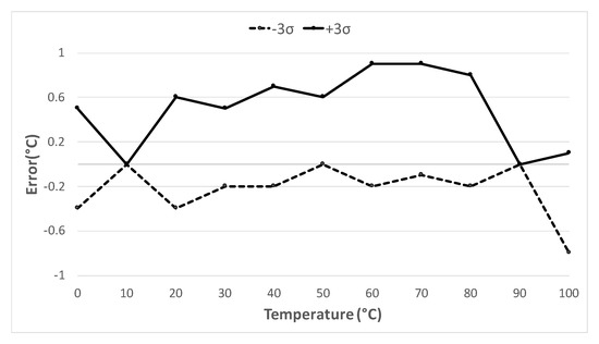 The sensor accuracy, ±0.9 was established by means of both Monte Carlo and corners simulations in a range from to , taking values every , and performing a 2-point calibration at and . The results of the corner analysis can be seen in Figure 8.