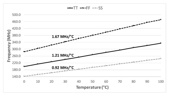 For the to temperature range considering all process corners, the oscillation frequency changes at a rate from 0.92 Hz/°C to 1.67 MHz/°C showed in Figure 10. As can be seen, the resolution is higher for the FF corner and lower for the SS corner.