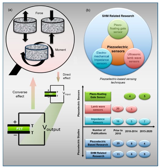 (a) Principle of the direct and inverse response in the piezoelectric effect, and (b) Summary of the studies in the piezoelectric-enabled sensing techniques in structural health monitoring (SHM).