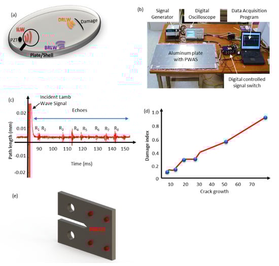 (a) A cracked aluminum plate showing incident Lamb waves (ILW), boundary reflected Lamb waves (BRLW) and damage reflected Lamb waves (DRLW) [51,52], (b) Experimental setup showing the plate, active sensors, and instrumentation [51,52], (c) the incident signal and the reflected (echoes) signals on sensor [51,52], (d) Damage Metric [58] (e) A CT specimen with PWAS.