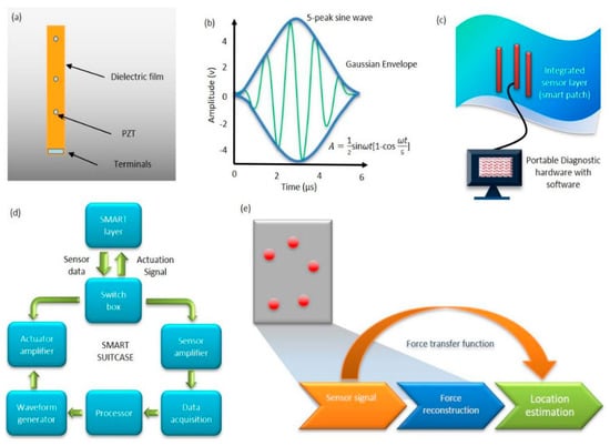 (a) The Stanford Multiactuator Receiver Transduction (SMART) Layer Technology [64], (b) 5-peak sine Waveform [63], (c) Thermal protective system (TPS) panel with smart sensor [62], (d) Smart Suitcase workflow [63], and (e) Overview of impact identification scheme [68] (Courtesy of Acellent).