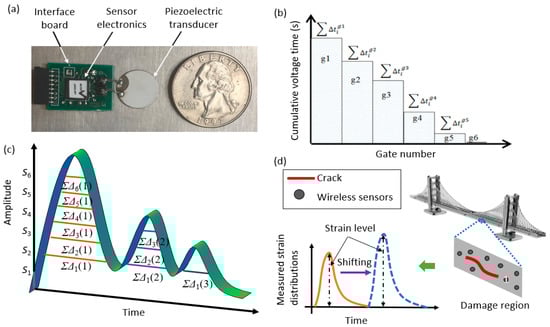 The PFG sensor consists of a series of memory gates that are next to the computational circuits. The detected information obtained by the piezoelectric transducer is transferred and stored in those gates. The duration of the transducer’s voltages (i.e., electrical signals) are recorded in the gates when the amplitude exceeds predefined thresholds, and the stored cumulative durations are regularly read using Radio Frequency Identification (RFID) scanners. The outputs of the PFG sensors are obtained in terms of histograms, which use the bins as a cumulative time for the events at specific strain levels [117].