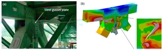 (a) A gusset plate structure, (b) finite element (FE) model of the failed gusset plate [15,73,74].