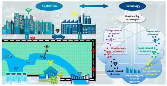 However, modern civil infrastructure systems are designed to achieve advanced functionalities for multipurpose applications under critical conditions such as earthquakes, storms and typhoons [127]. There are serious concerns about the integrity of such complex structural systems. A viable solution to this issue is to integrate a network of smart and embeddable sensors into civil infrastructure systems with local artificial intelligence (AI)/machine learning (ML) data-processing frameworks, enabling next-generation smart, civil infrastructure systems built on the traditional systems’ skeleton. The features of the piezoelectric sensing techniques reviewed in this study make them an ideal option. A substantial portion of the research in this area has gone into the SHM of bridges and pavements. Arguably, more research is needed to harness the capabilities of the piezoelectric sensing methods in other critical structural systems such as flood defenses and dams. Figure 7 envisions a smart, civil infrastructure platform with an integrated piezoelectric-based SHM functionality. In this platform, structures can wirelessly communicate health status, allowing for prompt assessment of the status and safety of those structures. However, a significant challenge would be to process the massive amount of information generated by the sensor networks, necessitating an enhanced smart, civil infrastructure platform with Big Data and cloud and edge/fog computing and internet-of-things (IoT) capabilities. Incorporating all of these features will create an ingenious and connected system that allows enhanced data-sharing and decision-foreseeing for the civil infrastructure systems. Besides, piezoelectric sensing techniques can play an essential role in maintaining the functionality of civil infrastructures under extreme conditions over a relatively long time. This topic needs remarkably more research. However, compared to other SHM sensing systems, piezoelectric sensors are still reliable and can be applied in different environments upon proper calibrations.