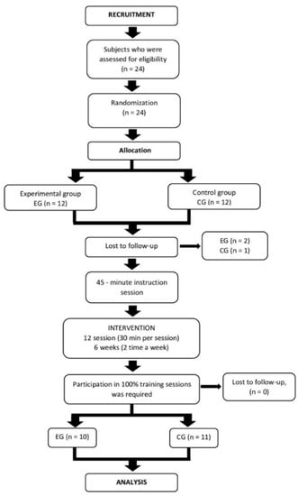 - Control group (CG)—HW not training on a balance platform using VR: initial n = 12.