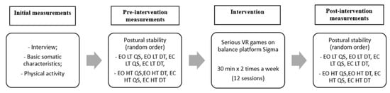 A general review of the experiment is shown in Figure 2. Intervention with the use of VR on the balancing platform was introduced in the subjects. The level of postural stability was examined before and after the intervention. The research was carried out at the Poznan University of Physical Education in Poland, at the Department of Physical Activity and Health Promotion Science.