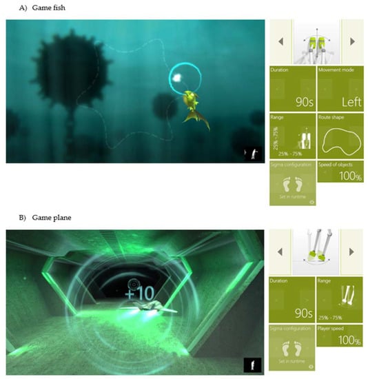 During training, audio-visual feedback for participants was used, i.e., biofeedback in the form of video games facilitating exercises through play. The games were simple and involved moving objects like a fish, plane, car and balls. For instance, in the fish game, the subject mainly practiced movement precision. The subject had the task of moving a blue circle to protect the fish from a source of sparks, which was safe when it was in the center of the circle (Figure 3). The game made it possible to measure and practice individual skills in implementing specific movement patterns while maintaining a set speed and range. The goal of the exercise was to repeat movements in 3D space, planned movement training, precision of movements and improving muscle strength. Alternatively, in the sample plane game, the subject practiced functional movements. The subject’s task was to fly a plane through circles. The closer to the circle they flew, the more points they scored (Figure 3). The subject was thus able to practice focus, perceptiveness, precision of movements, predicting the trajectory of moving objects in 3D space, as well as balance during the game.