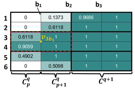 The investigated geographical area is denoted . Similarly to [22], is discretized into a grid. Each grid-cell has a rectangular shape and is divided into 4-adjacent sub-cells. Each cell has a positive value representing the percentage of area in it. A group of 4-adjacent sub-cells that includes three or four non-zero valued cells has a center v. We suppose that the UAV passes through the centers of the main grid-cells. We assume the grid is composed of n rows and m columns. The columns are denoted . A center is described by a pair of coordinates (,) and is located at row i and columns (see Figure 2).