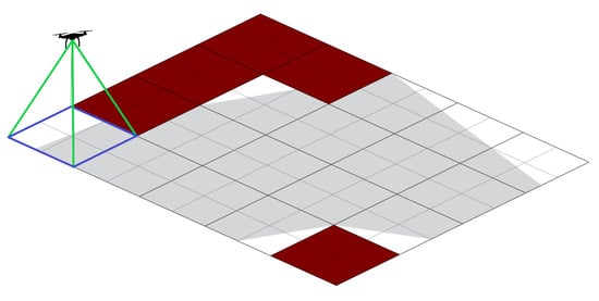 The grid-based technique decomposes the area of interest into cells. Grid cell size is determined by the resolution and field of view (FoV) for the camera called UAV footprint. Figure 3 shows a schematic of the field of view where the blue rectangle represents the UAV footprint. The area of interest is shown in grey color and red boxes represent NFZ.