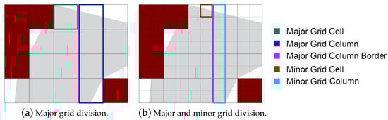 Each grid cell has length L and width W. Concerning the scan direction of the UAV, the shortest side of the cell will be parallel to the longest side of the grid. If the UAV moves in a vertical track, then the shortest side of the cell will be parallel to the long side of the grid, and vice versa for the horizontal tracks. We apply a sub-division on the area to make efficient path planning to identify the non-zero value portions of the grid. This sub-division splits each major grid cell into four quarter sections called subcells (minor grid cells), as shown in Figure 4. Each group of four minor grid cells forms a UAV footprint, which represents the area that can be covered at once.