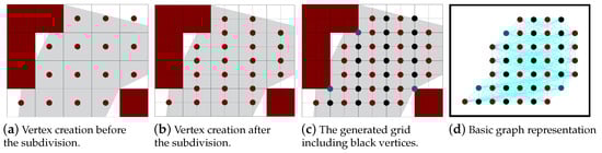 Usually, the grid cells are represented by vertices at the center of each cell. Only non-zero cells are represented. These vertices are connected using the path planning algorithm. Figure 5a,b show the representation of the vertices before and after the sub-division. In the major grids, the vertices could represent semi-empty cells, while in the minor grids minor empty cells are not represented. The path tracks move through the columns in the major grid, and a turn occurs between them passing through their border. For better selection for the turning position, new helping vertices are represented on the border column as shown in Figure 5c (black vertices). The vertices are colored then the edges are created and assigned weights. Later the path is planned. Figure 5d represents the basic graph with all possible edges. In the below section, we present the different algorithms for vertex-coloring, edge creation and weighting and path planning.