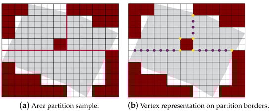 Figure 6 shows the effect of considering blue vertices. In Figure 6a, the path is planned without the blue vertices. As you can see the path moves over an NFZ. On the contrary, in Figure 6b, with the help of the blue vertex, the planned path avoids the NFZ. On the other hand, in order to define the partition borders, a new set of vertices is created. The partition borders are represented by vertices with purple color, but if a vertex lies on an NFZ border, it changes the vertex color to yellow as shown in Figure 7. These vertices help in avoiding the collisions between different paths. They also help in finding the best joining edges between the paths in case a single UAV is used to cover the whole area. This mechanism is discussed in Section 5.3.