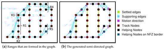 The vertices are grouped into ranges to simplify the edge creation mechanism. This is an essential phase for the graph filtering. Ranges impose specific permissions on the vertices to form edges. The vertices are grouped into five ranges {R1, R2, R3, R4, R5} (see Figure 8a). Range 1 includes vertices that are not eligible to be turning points. Ranges 2 and 3 include brown candidate turning points. Ranges 4 and 5 include black candidate turning points. The ranges force the vertices to connect to certain neighboring nodes for better graph filtering. The edge creation is discussed in Section 4.2. Since there are two turning sides on a track we assign a key-value for each vertex in a range. The keys help in the path planning phase, where the algorithm searches for the best turning path between two tracks. This part will be discussed in Section 4.4.