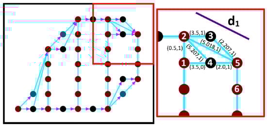 Figure 9 shows a sample of edge weighting. Suppose the UAV passes from brown node 1 to the next brown node 5, with a speed of 10 unit/sec and a rotation rate 30 degree/sec. To find the coverage value for the edge , we need to draw the line d1, which corresponds to the UAV footprint border while passing along the edge. In this case, we have the black node 3 above the edge , we will calculate if black node 3 belongs to the line d1 or falls below the line, which means that it is covered.