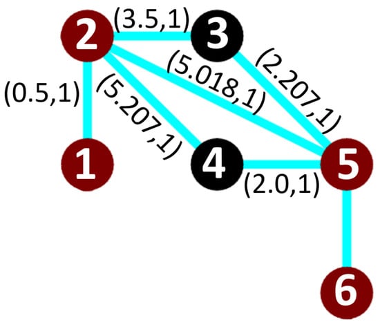 Every edge is labeled with a tuple , where represents the time needed for a UAV to move from vertex u to vertex v. The value indicates whether the passage over the current edge will cover the nearby nodes (above or below u and v) according the turning node position. If so, the cost of the edge is 1 (i.e., ), otherwise it is 0 (i.e., ).