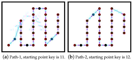 The generated graph has some edges with the direction associated with them. We call it a semi-directed graph in the sense that the movement direction of the UAV is not defined until the path planning step terminates. Figure 8b shows an example of the obtained semi-directed graph. Similarly to [22], the start point in our work is known. It is either the first or last brown point on the left column of the grid. If there is only one possible starting point, two keys could be assigned to this node (11 or 12).Consequently, two paths are generated, one path for each starting point. More details about this phase will be discussed in Section 4.4.