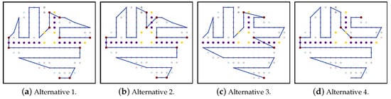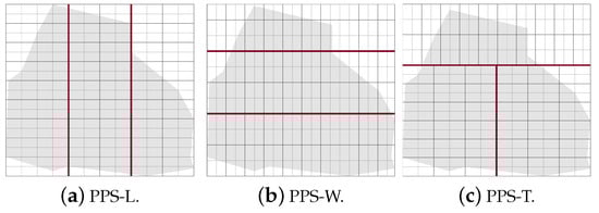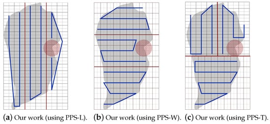 - NFZ located at the top side of the grid:Figure 25a–c shows the CPP obtained by PPS-L, PPS-W and PPS-T, respectively.