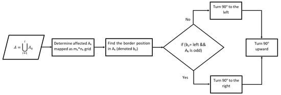 is partitioned into a set of l sub-areas, where . For every , a graph is formed. The set of graphs is disconnected. We denote the set of UAVs where ≥ 1. We assume that the UAVs can communicate with each other, by using a WiFi or mobile cellular technology, and coordinate on the information to exploit to plan their paths collaboratively. For each UAV, we assign a path . Each path is formed of a set of vertices and edges and has a set of turning points with turning angles . In the scenario where we use a single UAV, the total path . The aim is to find the shortest path that links all the partitions, avoids the NFZ and ensures full coverage with low energy consumption.