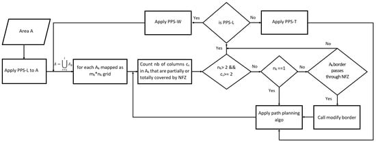 Figure 29. NFZ is located at the middle part of the grid.Table 11 shows that PPS-T generates a shorter path than PPS-W with a slight difference of 0.20%. It lowers the turning angles in PPS-T by 22.22% over PPS-W. The average completion time in PPS-T is reduced by 5.22% over PPS-W, with energy saving of 3.53%.