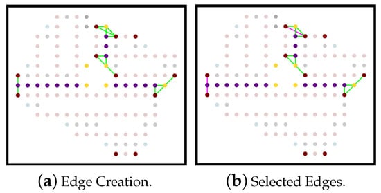 Algorithm 1 assigns keys to brown colored vertices according to their location on the grid. Vertices that correspond to the first or last cells in the grid’s columns are more likely to be turning points (lines 1–4). Moreover, the vertices are divided into ranges to locate their positions that will help in then key assigning keys for each vertex (lines 5–30). A key value is assigned for each vertex in a range. The values of the keys are {00, 11, 12, 21, 22}. The vertices that belong to range 1 have a key equal to 00 (lines 31–33) and are not eligible to be turning points. The vertices that belong to range 2 and range 3 have a key equal to 12 or 11 (lines 34–39) and are considered candidate turning points. Algorithm 2 assigns keys to black colored vertices. Black vertices are divided into ranges according to their location with respect to the neighboring brown vertices in ranges 2 and 3 (lines 1–7). The vertices that belong to the range 4 and 5 will hold the key 21 and 22, respectively (lines 8–10, 11–13). In the next section, we will explain how the vertices are connected to form edges.