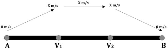 For the sake of simplicity, let us assume that we want to cover a whole area by traveling at a constant velocity Y. Given a track that will be traversed by a UAV with horizontal speed between 0 and X m/s. In Figure 20, represents the distance traversed with velocity between 0 and X m/s to reach the constant speed X. From to the UAV moves at a constant speed X m/s. Then from to B, the speed varies between X and 0 m/s. We choose Y to be the approximate average velocity ( m/s) to traverse the track , which enables a fair comparison to the different approaches. The value of Y is calculated as follows: