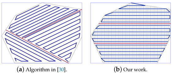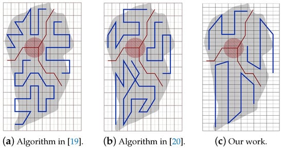 Figure 22. The paths generated by the algorithms in [19,20] and by our algorithm while using partion method in [19,20].Table 6 shows that the total path’s length in our work is shorter than the paths in [19,20], by 8.02% and 20.18% respectively. In addition, our work lowers the total turning angles by 59.46% over [19] and by 51.03% over [30]. In our work, the completion time is reduced by 31.33% compared to [19], and 31.69% compared to [20]. The gain in energy is 21.90% in our work compared to [19], and 26.65% compared to [20]).