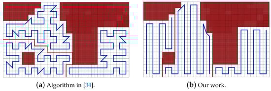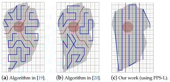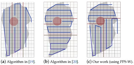 Figure 24. The paths generated by the algorithms in [19,20] and by our algorithm with PPS-W.Table 8 shows that the total path length in our work using PPS-L is shorter than the paths using PPS-T by 7.72% and greater than PPS-W by 2.81%. PPS-L decreases the total turning angles by 50.00% over PPS-W and by 42.85% over PPS-T. In PPS-L, the completion time is reduced by 10.30% and 14.99% over PPS-W and PPS-T, respectively. The gain in energy is 4.09% and 12.85% over PPS-W and PPS-T, respectively.