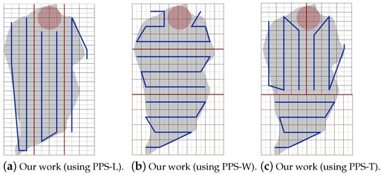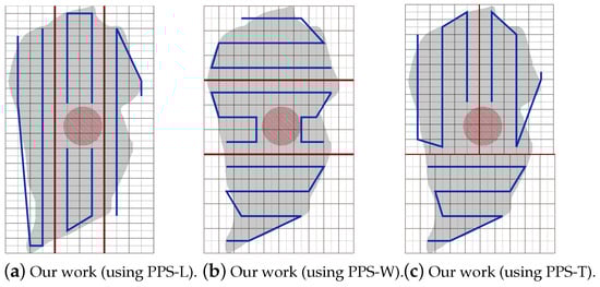 Figure 25. The paths generated by the algorithm by our algorithm using PPS-L, PPS-W and PPS-T with NFZ located at the top of the grid.To evaluate the average performance for the partition methods, we assume that the speed is 9 m/s and rotation rate is 35 degree/sec. Table 9 shows that the PPS-W generated a shorter path than PPS-L and PPS-T by 2.15% and 2.43%, respectively, with lowering the turning angels in PPS-L by 65.41% and 57.14% than in PPS-W and PPS-T, respectively. The average completion time in PPS-L shows a gain by 12.84% and 10.74% against PPS-W and PPS-T, respectively, with lowering the energy by 7.39% and 6.84% against PPS-W and PPS-T, respectively.