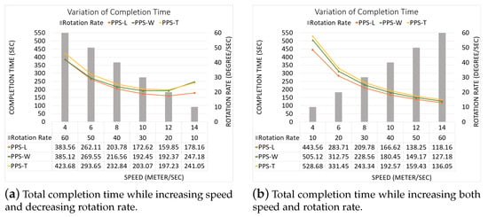 Table 10. Our CPP using our PPS-L partition method vs. PPS-W partition method vs. PPS-T partition method.Figure 28 shows the variation of the completion time in each area. In Figure 28a, the results are obtained by increasing both speed and rotation rate. In Figure 28b, we decrease speed while increasing the rotation rate.