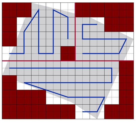 In this scenario, we compare our path planning algorithm to the algorithm provided in Di Franco et al. [16]. Authors in [16] plan the path in the presence of NFZ. They use two minimum-cost methods (O-F) and (E-F). The O-F method calculates the lower cost paths based on the sum of the total turning angles, while the E-F computes the energy consumption estimation. In our work, we partition the area using our PPS method, then we plan the path, then the partition borders are removed and the paths are connected to cover the area using a single UAV. Figure 31 shows the area after applying PPS-T method. Note that the NFZ cells are the red cells.