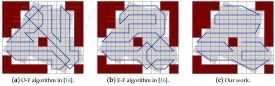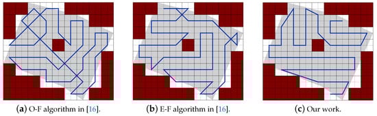 Figure 33. Paths generated by the two algorithms in [16] and by our algorithm.The results in Table 13 show that the total path’s length of our work is shorter than the paths of [16] using O-F and E-F methods by 12.60% and 10.04%, respectively. PPS method lowers the total turning angles by 17.33% in both. In our work the completion time is reduced by 15.14% and 14.01% over O-F and E-F methods, respectively. It achieves a gain of 14.21% and 12.58% in the consumed energy against paths planned by O-F and E-F, respectively.