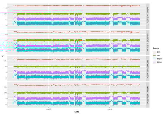 Table 1 presents a summary of the statistics for the data by sensor and by InRow. This table shows how the average is around 20 C for the supply air sensor, 27 C for the return air, 11 C for entering fluid and 15 C for leaving fluid. The highest standard deviation is given by the fluid sensor that enters with a value of around 1 C. The lowest standard deviation is presented by the return air sensor.