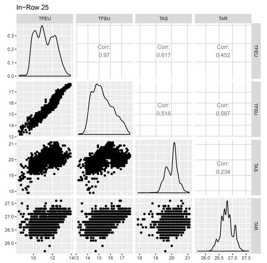 Secondly, an analysis of the correlation between the sensors in the InRow has been made. Figure 3 displays the InRow 25 outcome, the Pearson correlation coefficient, in the upper triangle, distributions on the diagonal and a scattered plot in the lower triangle. The correlation between the fluid sensors is always high, as expected. There is also a small correlation between the supply temperature and the leaving fluid temperature. However, the return air temperature is poorly correlated with the other sensors, presenting a certain independence. The results for the other InRows are almost identical.